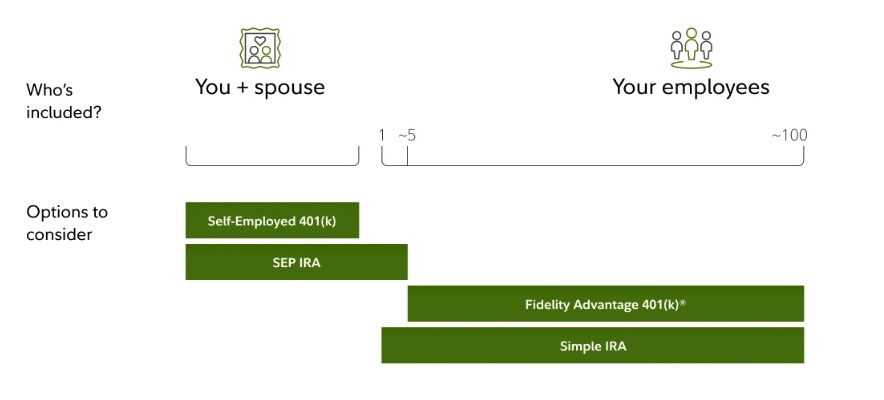 | Self-Employed 401 (k) | SEP IRA | Fidelity Advantage 401 (k) | SIMPLE IRA |